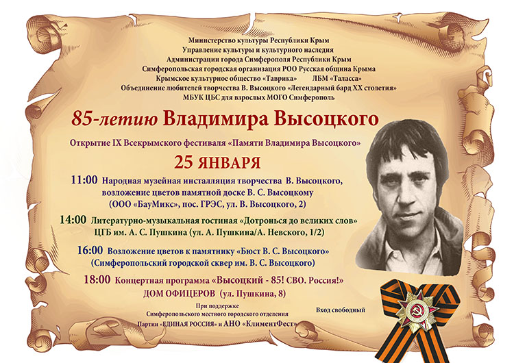 25 января 2023 года крымчане отметили юбилейную дату – 85 лет со дня рождения всемирно известного поэта, автора-исполнителя, актера театра и кино Владимира Семеновича Высоцкого. Силами представителей Русской общины Крыма, Крымского культурного общества «Таврика», Центральной городской библиотеки им. А. С. Пушкина, литературно-бардовской мастерской «Таласса» и АНО «КлиментФест», при поддержке Министерства культуры Республики Крым, управление культуры и культурного наследия Администрации города Симферополя Республики Крым, творческого союза «Ассоциация деятелей эстрадного искусства Республики Крым» и Клуба Батальон ФОРПОСТ при гарнизонном Доме Офицеров в Симферополе проведены торжественные мероприятия, посвященные 85-летию В.С. Высоцкого. Пол традиции, данные мероприятия открыли IX Всекрымский фестиваль «Памяти Владимира Высоцкого».