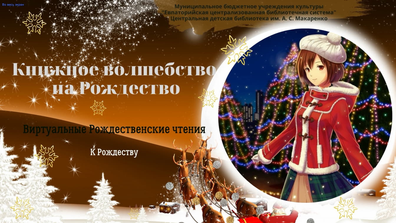 Рождество - чудесный, удивительный и волшебный праздник. Мы ждём его в радостном волнении и предвкушении чуда. Читатели Центральной детской библиотеки им. А. С. Макаренко предлагают вам провести зимние каникулы с интересной книгой, уютно устроившись у тёплого камина и наряженной ёлки. Предлагаем вашему вниманию виртуальные Рождественские чтения «Книжное волшебство на Рождество» . Читая книгу, вы попадёте в мир чудес и волшебства!