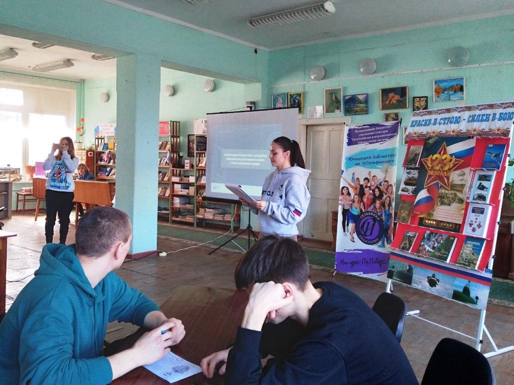 Cотрудники юношеской библиотеки им. И. Сельвинского совместно с евпаторийским отделением Всероссийского общественного движения «Волонтёры Победы» организовали квиз «Великие произведения России» . Мероприятие проведено в рамках интеллектуально-развлекательного проекта «Игры разума с Сельвинкой» , который стартовал в январе этого года.