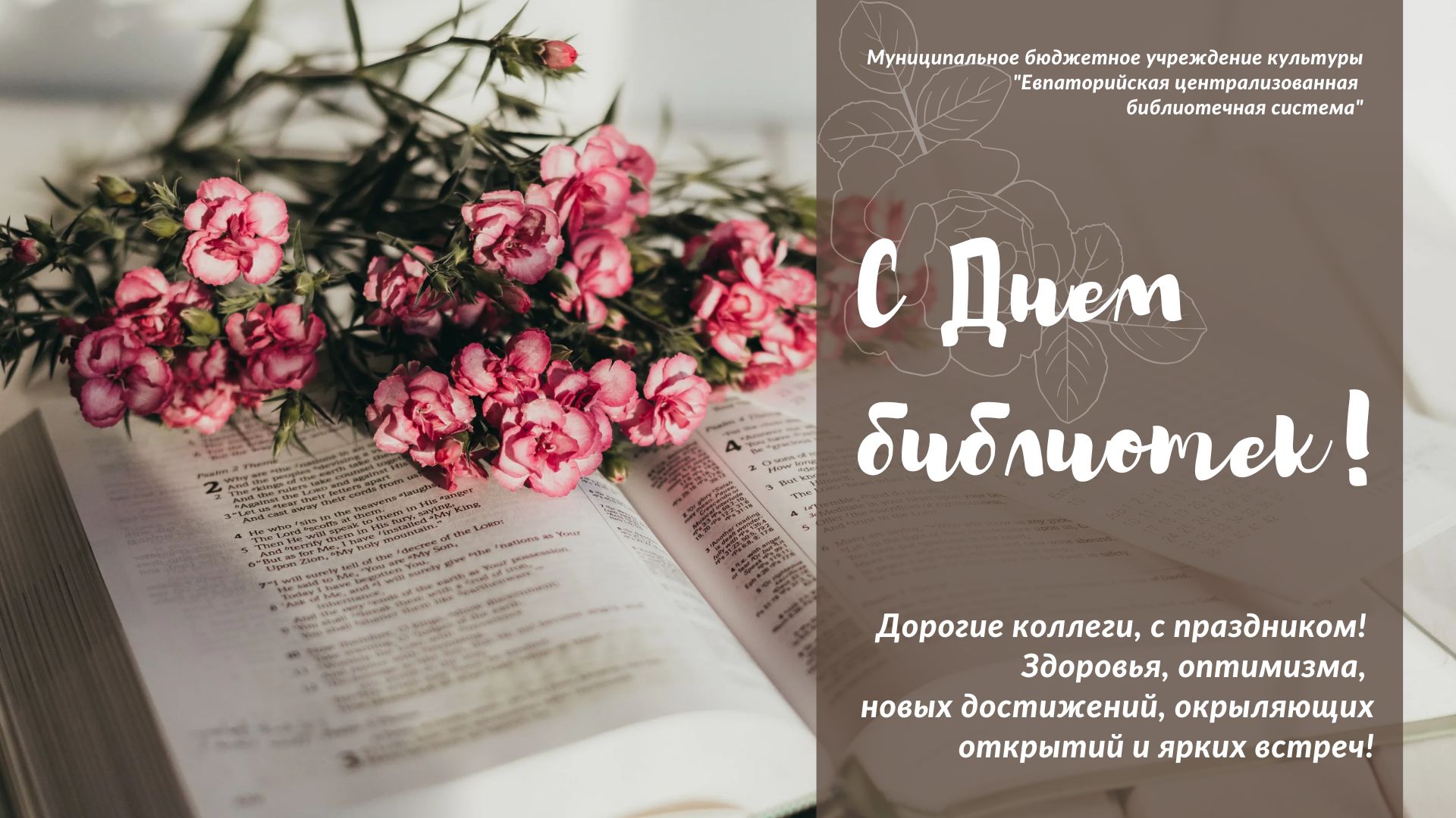 Администрация Евпаторийской централизованной библиотечной системы сердечно поздравляет коллег, своих читателей, друзей и партнёров, всех, кто любит книгу и не представляет своей жизни без чтения, с прекрасным праздником – Общероссийским днём библиотек !