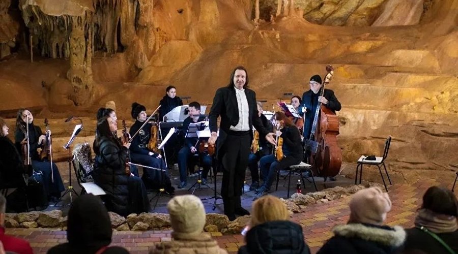 Концерт «Звуковой сплав 3» Фото со страницы камерного оркестра «Новая гармония» в ВКонтакте В Крыму продолжают устраивать концерты и показывать спектакли в пещерах.