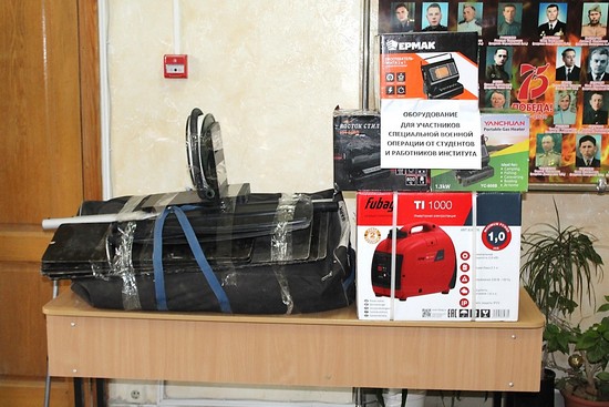 В Институте прошла благотворительная акция, в ходе которой на собранные средства была проведена закупка оборудования (надувной ПВХ лодки со снаряжением, инверторного бензинового генератора, 3 газовых плиток-обогревателей и др.), которое 25 февраля 2023 года было передано в одну из воинских частей.