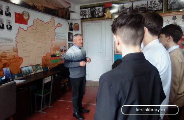 В День памяти о россиянах, исполнявших служебный долг за пределами Отечества, для учащихся МБОУ «Школа № 9 им. С. Борзенко» Центральная детская библиотека им. В. Дубинина организовала посещение Керченского музея воинов-интернационалистов, где состоялся диалог о мужестве и доблести «Памятью сердца в минувшее», который провел председатель Керченского городского отделения Крымской региональной организации «Российского Союза ветеранов Афганистана и специальных военных операций» С. Г. Петров.