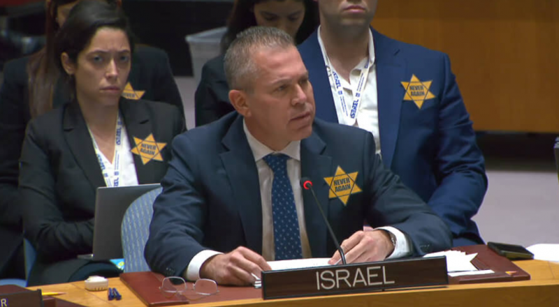 Представители режима Нетаньяху в ООН надели бутафорские желтые звёзды, пообещав не снимать их до тех пор, пока Совбез ООН не станет делать так, как они хотят. В Газе убито уже 63 сотрудника ООН. Директор мемориального комплекса Яд ва-Шем Дани Даян заявил, что «поведение израильской делегации в ООН оскорбляет жертв Холокоста и позорит государство Израиль».