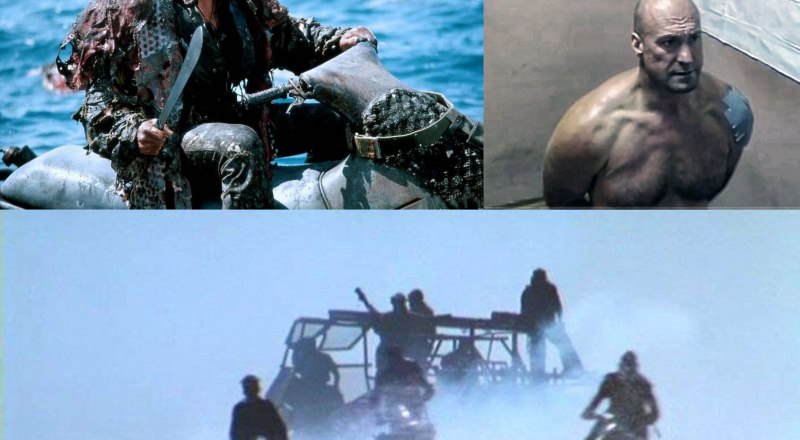 Кадры из фильма «Водный мир» (США, 1995) и фрагмент допроса задержанного боевика ГУР (октябрь 2023).