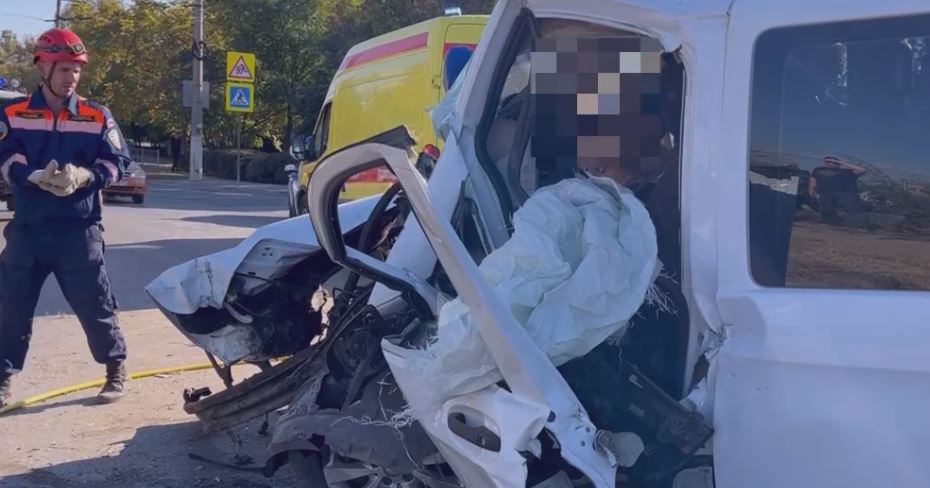 Пассажирский микроавтобус врезался в световую опору на улице Хрусталёва в Севастополе.