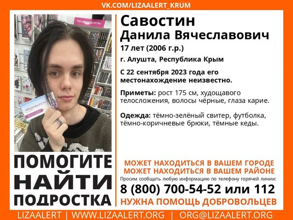 Волонтёры крымского отделения поискового отряда «Лиза Алерт» в Алуште разыскивают 17-летнего Даниила Савостина, местонахождение которого неизвестно с 22 сентября этого года.