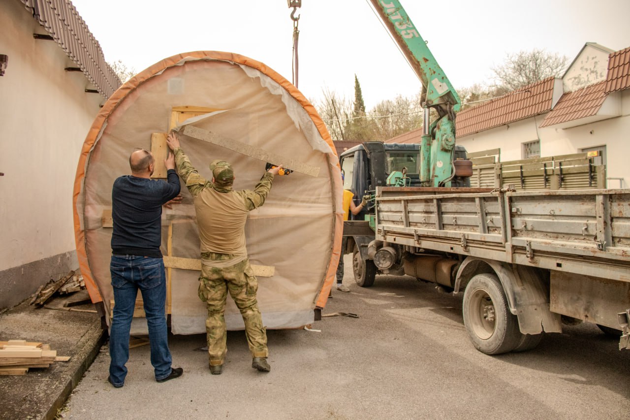 «Она полностью укомплектована – здесь есть печка каменка, емкости для воды, веники, тапки, шапочки, мыло. Доставить подарок непросто - бани «Лукоморье» изготавливают в Екатеринбурге, в Крым едут 3000 километров. А уже отсюда, после длительных согласований, военные на «УРАЛе» везут их за «ленточку». Эту доставят на Донецкое направление летчикам», - сказала Янина Павленко.