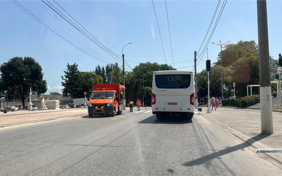 Накануне подрядчик установил кнопочный светофор в месте, где люди будут переходить проезжую часть к морю и в обратном направлении.