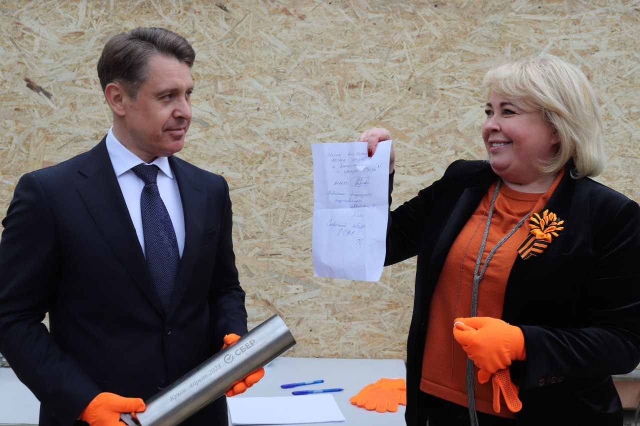 Глава администрации Ялты Янина Павленко вместе с представителем Сбербанка в Крыму Андреем Подсвировым заложили «капсулу времени» на месте будущего офиса