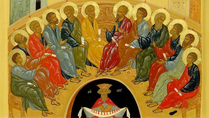 Дух Святой, по обетованию Спасителя, сошел на апостолов в Иерусалиме в виде огненных языков, в знак того, что Он дал апостолам способность и силу для проповеди Христова учения всем народам.