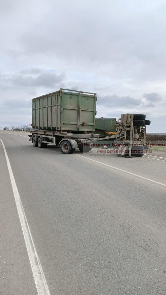 7 января в 13 часов на автодороге «Таврида», водитель многотонного мусоровоза-мультилифта на закруглении дороги на с.Луговое не справился с управлением, произошло опрокидывание прицепа и автомобиля,