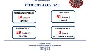 По данным Минздрава РК, за минувшие сутки на полуострове зафиксирован 61 новый случай коронавирусной инфекции. Госпитализировано 14 человек, выздоровело 29 человек, летальных исходов не зарегистрировано.