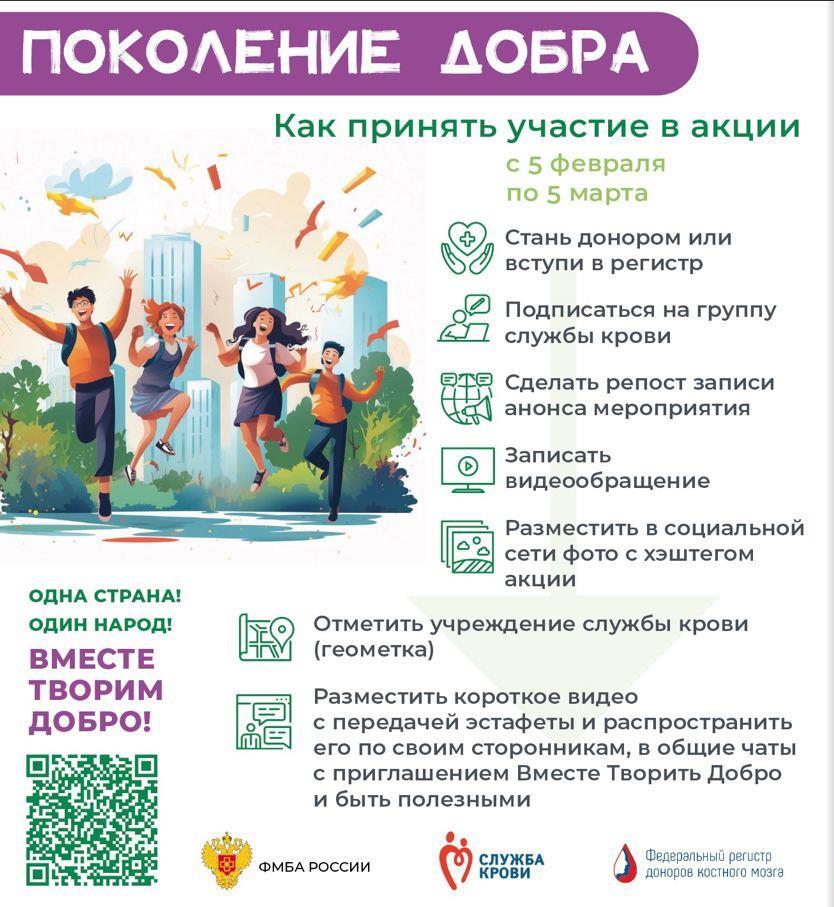 С 5 февраля по 5 марта при поддержке Федерального медико-биологического агентства во всех регионах страны проходит Всероссийская акция «Поколение добра». Донорская акция «Поколение Добра» объединяет неравнодушную молодежь России.