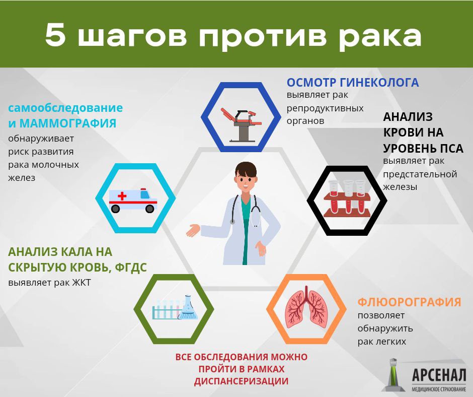Какие виды обследований на выявление рака можно пройти бесплатно по ОМС в рамках диспансеризации? Рак молочной железы . Всем женщинам от 40 до 75 лет рекомендуется проходить маммографию для каждой из молочных желез в двух проекциях. Периодичность такого обследования — раз в 2 года. Важно показать снимки двум разным врачам. В случае подозрения на опухоль могут быть назначены дополнительные исследования (например, УЗИ или КТ). Рак шейки матки . Этот вид обследования на рак рекомендован женщинам с 18 до 64 лет. Он включает осмотр у гинеколога или фельдшера в рамках диспансеризации, а также взятия мазка с шейки матки для пап-теста (мазок Папаниколау) раз в 3 года. Колоректальный рак . Он опасен как для мужчин, так и для женщин. С 40 до 64 лет нужно делать анализ кала на скрытую кровь раз в два года, а с 64 до 75 лет — каждый год. Рак предстательной железы . Всем мужчинам в возрасте 45, 50, 55, 60 и 64 лет рекомендован анализ на определение простат-специфического антигена (ПСА) в крови. Рак лёгких. Флюорография позволяет выявить злокачественную опухоль или туберкулёз ещё на ранней стадии, когда симптомы заболевания не проявляются и диагностика болезни затруднительна. При жалобах на постоянную одышку, вялость, хронический кашель рекомендуется обязательно сделать флюорографию.Онкоскрининг очень важен, потому что выявление заболевания на ранних стадиях благоприятно влияет на процесс лечения, динамику и дальнейшее наблюдение. 95 процентов пациентов, у которых болезнь обнаружили на ранней стадии, удается полностью вылечить.