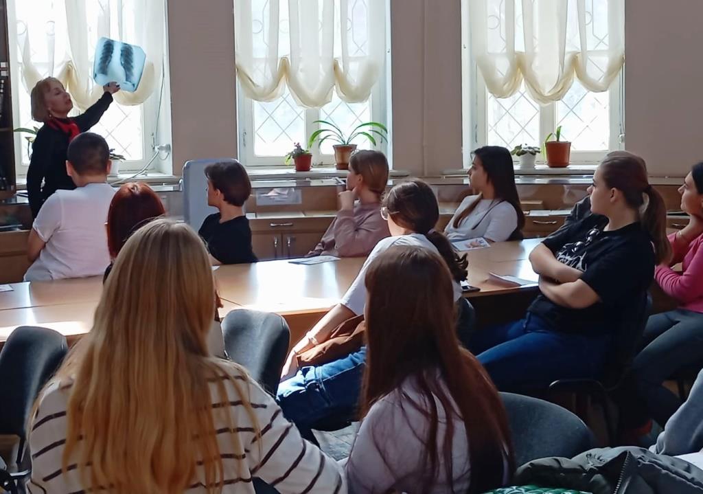 Перед студентами-первокурсниками медицинского колледжа «Монада» выступила заведующая противотуберкулёзным диспансером города Евпатории, врач-фтизиатр высшей категории Любовь Козлова. Она подчеркнула, что 24 марта наша планета отметила Всемирный день борьбы с туберкулёзом, и что сегодня, в преддверии Всемирного дня здоровья, очень важно вновь поговорить о профилактике этого серьёзнейшего инфекционного заболевания. Студенты услышали историю обнаружения «микробактерии туберкулёза» немецким учёным Робертом Кохом в 1882 году, узнали о вакцине БЦЖ, которую делают новорождённым, а также про метод туберкулинодиагностики, когда надо проверить реакцию на раздражитель. Любовь Владимировна продемонстрировала разные уровни заболевания туберкулёзом на рентгеновских снимках реальных пациентов, показала также снимки, запечатлевшие различные периоды выздоровления. Перечислила медикаменты и способы борьбы с постоянным возбудителем – туберкулёзной палочкой, которая живёт в каждом человеке, вне зависимости от его возраста.