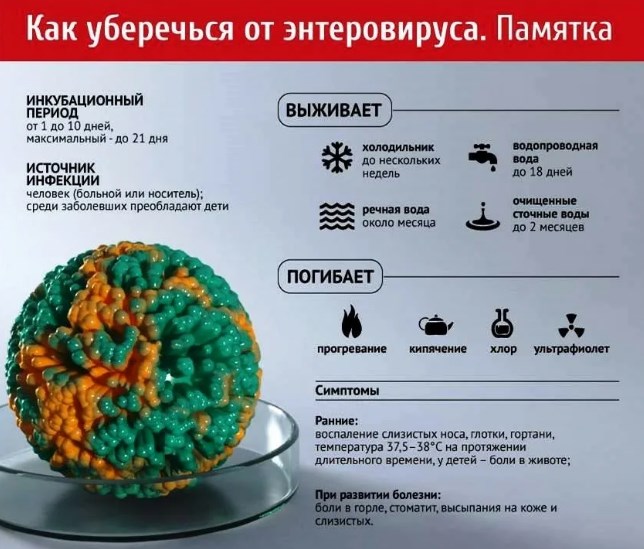 Инкубационный период (период от попадания вируса в организм человека до появления первых клинических признаков) при энтеровирусной инфекции составляет от 1 до 10 дней (чаще 2-5 дней).