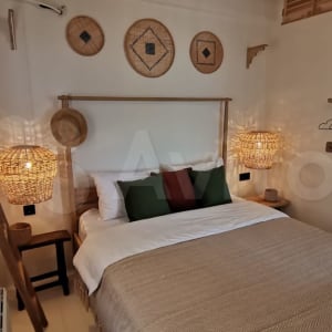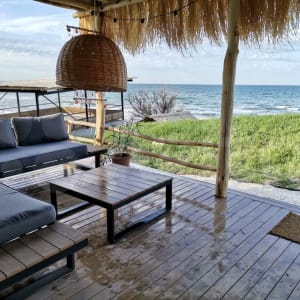 Бунгало оформлены в Средиземноморском стиле, полностью оборудованные для комфортного проживания 6-7 человек. Две спальни, два санузла, кухня-гостиная, со всей необходимой техникой и посудой, уютный чердачок со спальным местом,  большая терраса с видом на море, камин, wi fi. На территории площадка для занятий йогой, зона барбекю, сёрф бар, расположенный на пляже, парковка
